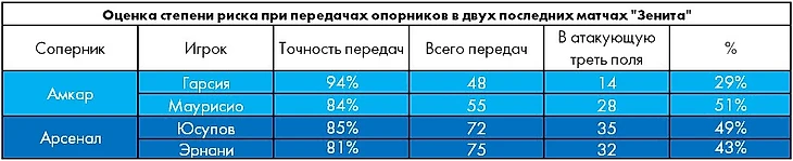 Кроме того, в матче с «Арсеналом» зенитовские опорники не стеснялись прибегать к дальним переводам, сделав 19 попыток (10 из них – в финальную треть поля), тогда как от их партнеров туром ранее таких передач было сделано только 7 (2), а уровень точности оказался вполне сопоставим (78% / 85%).