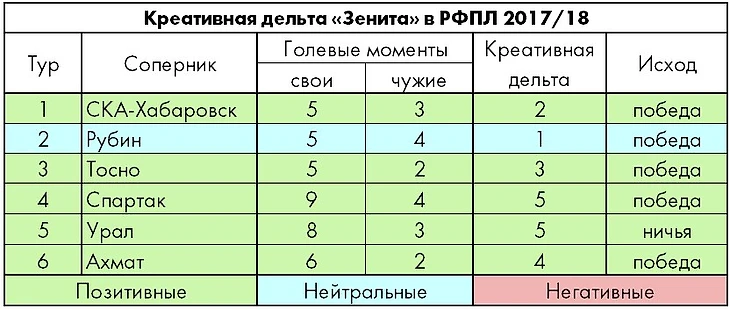 Креативная дельта по итогам матча оказалась в пользу «Зенита» (6-2 по созданным голевым моментам), причем случилось такое уже в 5 раз за 6 сыгранных туров. При этом наблюдается явная положительная динамика и в значении этой дельты по сравнению с первыми матчами при Роберто Манчини.
