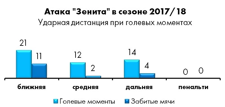 При этом количество высокоэффективных голевых моментов, связанных с ударами с ближней дистанции (в пределах 6 метров от ворот), находится на очень высоком уровне – 45%.