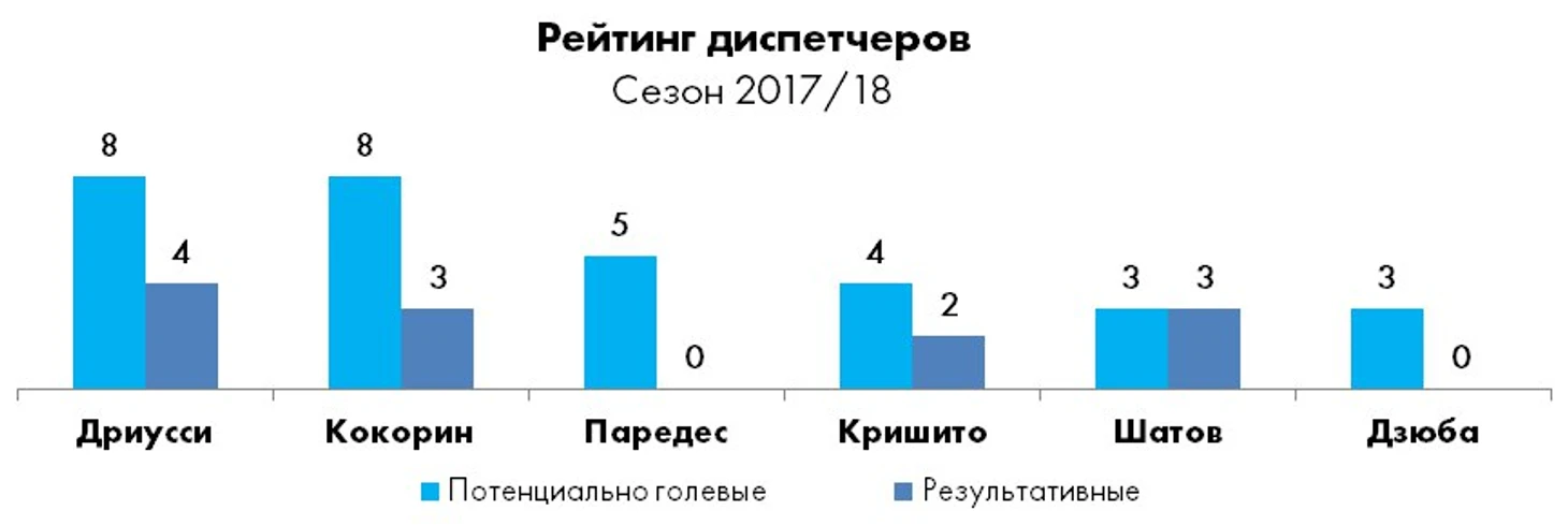 Не отстал от Александра и его напарник Дриусси, который записал на свой счет уже четвертую голевую передачу в сезоне (три из них – на Кокорина) и возглавил текущий рейтинг зенитовских диспетчеров. Ключевую роль аргентинец сыграл и в третьей результативной атаке, сделав ключевой отбор в чужой штрафной, который в забитый мяч преобразовал Кузяев.
