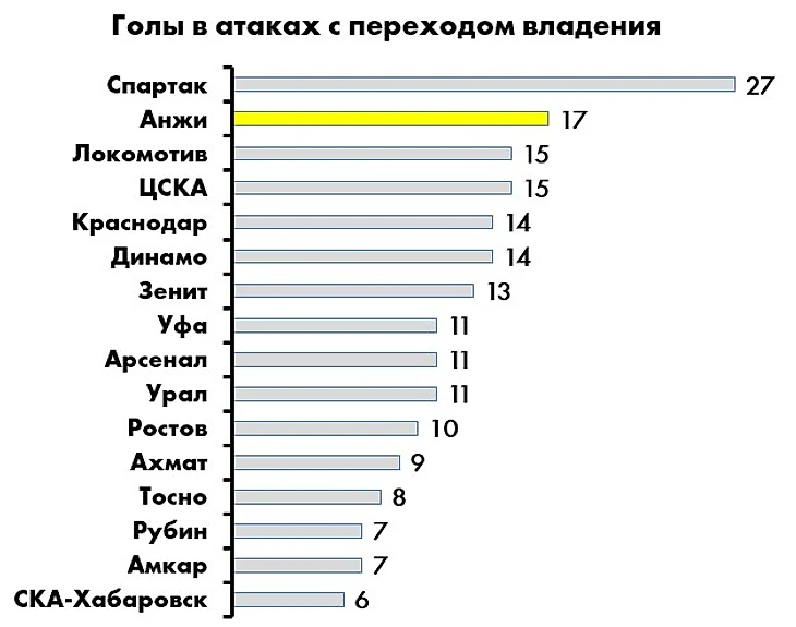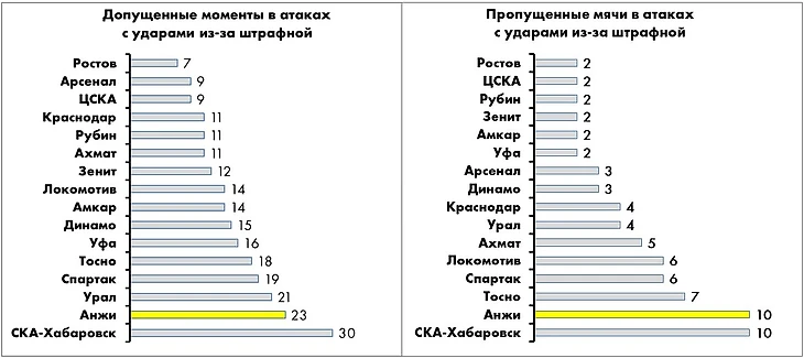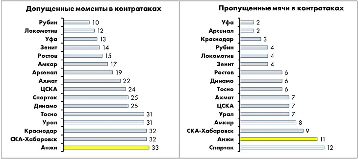 По количеству опасных контратак на свои ворота «Анжи» - худшая команда лиги, по пропущенным голам – вторая с конца (интересно, что хуже только «Спартак»).