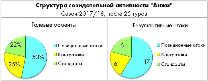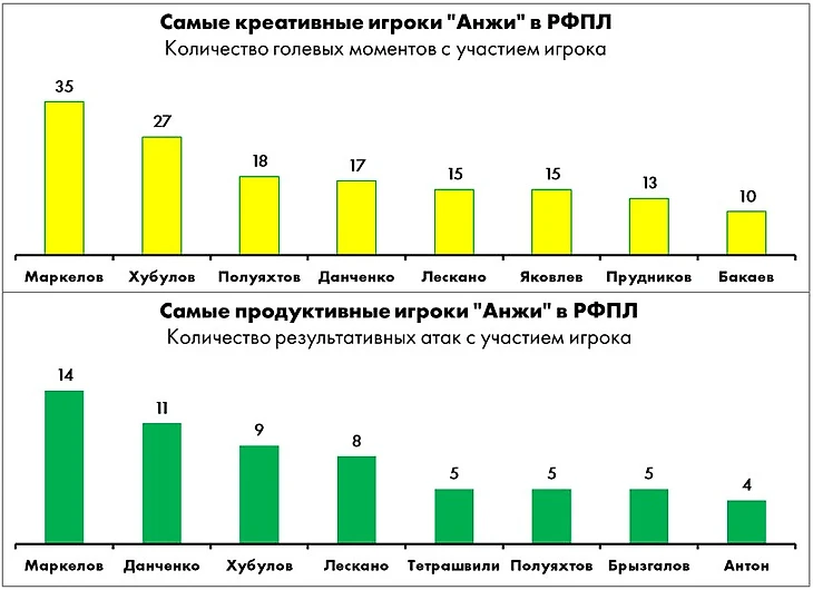 Если же говорить о сезоне в целом, самыми вовлеченными и полезными атакующими игроками «Анжи» являются оттянутый форвард Иван Маркелов (самый продуктивный игрок лиги, выступающий не в командах из топ-5) и креативный хавбек Арсен Хубулов. Первый, впрочем, на фоне недавней травмы в двух последних матчах был не слишком заметен и отправлялся в раздевалку сразу после перерыва.