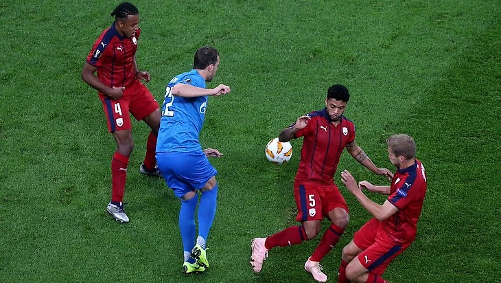Проблемы «Зенита» с продвижением мяча и выхода со своей половины были схожи с тем, что мы видели в матче с «Динамо». Французы, используя обычные для себя 4-3-3, создали максимальную плотность в центре, прижимая зенитовцев к «канатам»-бровкам.