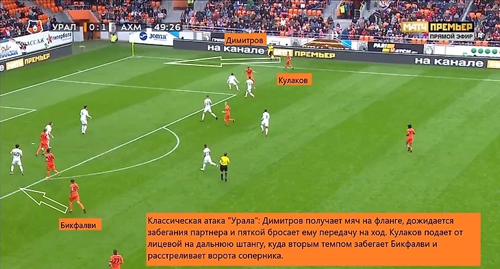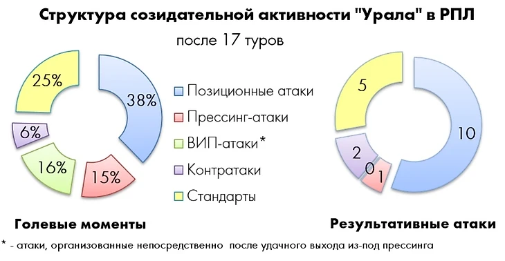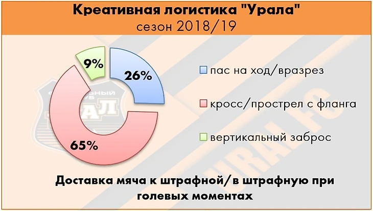 В статичных атаках с длительной фазой пассивного контроля мяча на чужой половине поля «Урал» забил 10 мячей (вдвое больше, чем, например, «Спартак»), причем почти все результативные цепочки (9 из 10) завершались по единой схеме «навес/прострел с фланга – замыкание».