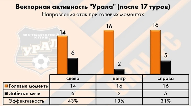 Как следствие, уральцы идут на первом месте в лиге по голам после фланговых атак (11), но при этом центральный вектор осенью у них почти не работал.