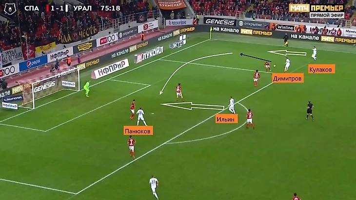 Правый защитник Кулаков практикует очень высокие подключения за спину Димитрову, получает передачи на ход и часто подает практически от лицевой по уходящей от вратаря траектории.
