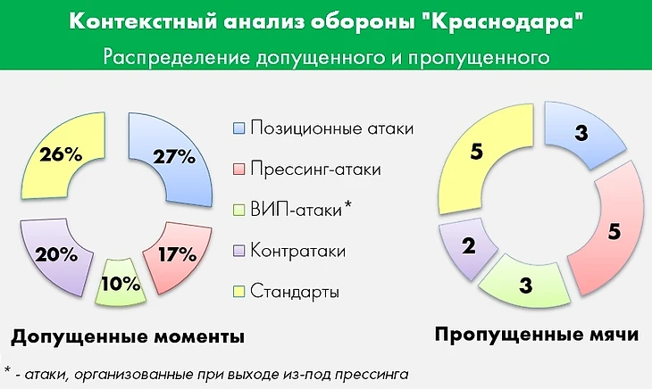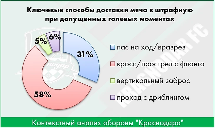 Навесные стандарты особо опасны для «Краснодара» даже несмотря на то, что оба центральных защитника – Мартынович (192 см) и Спайич (188 см) – отлично играют вверху (69% и 71% выигранных единоборств соответственно). Но других гренадеров в распоряжении у Мусаева нет, и против силовых команд вроде «Ростова», «Оренбурга» или того же «Зенита» краснодарцам явно не хватает габаритов в эпизодах, когда в штрафную подтягиваются два-три больших центрдефа.