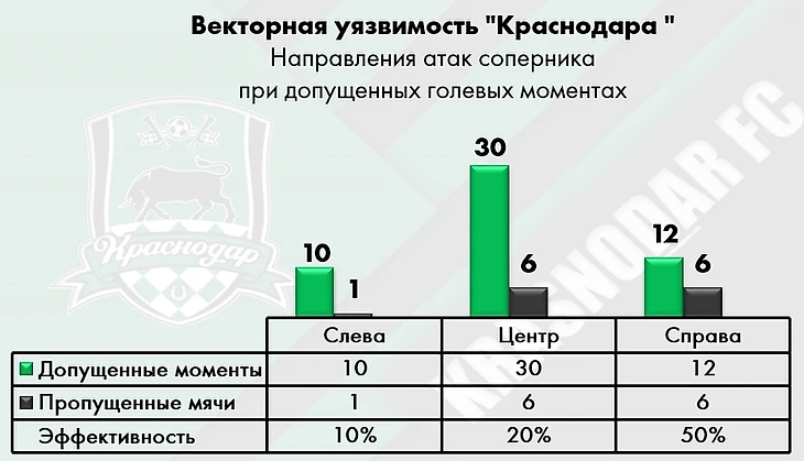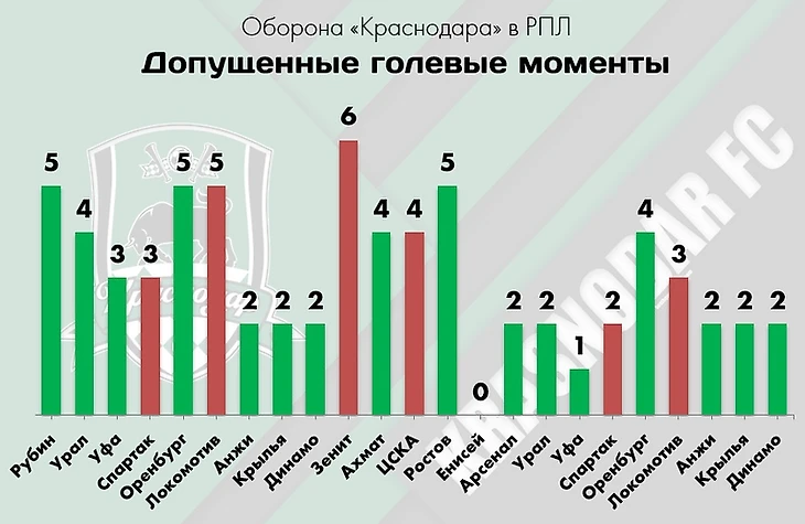 Только однажды за весь чемпионат «быки» позволили сопернику создать более 5 голевых моментов у своих ворот (уровень надежности, который считается условно приемлемым), причем случилось это в матче первого круга как раз с «Зенитом» (6 моментов/5 явных). Для сравнения в прошлом сезоне соперники «Краснодара» пробивали эту «границу устойчивости» сразу в 9 матчах из 30 (!).