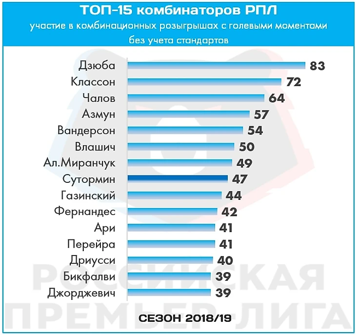 Важно и то, что на протяжении сезона он был достаточно стабилен в плане креатива, только в 3 из 29 сыгранных матчей не отметившись в атаках с голевыми моментами (к примеру, у Алексея Миранчука 4 «холостых» матча в сезоне, у Виктора Классона – 2).