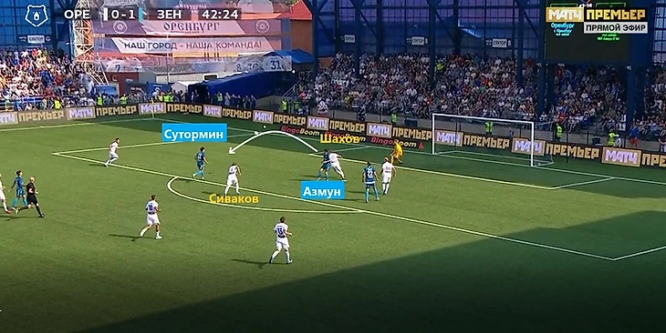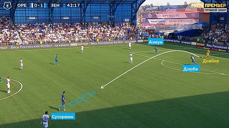 Помимо прессинга, «Зенит» дважды ловил соперника на контратаках, причем оба раза после подборов Сутормина. В первом случае Оздоев классной передачей вывел 1v1 Азмуна (что-то похожее в исполнении Магомеда мы видели и в предыдущем поединке), во втором о своих навыках первого паса напомнил давно не игравший Маммана, отправив на рандеву с Довбней уже Барриоса.