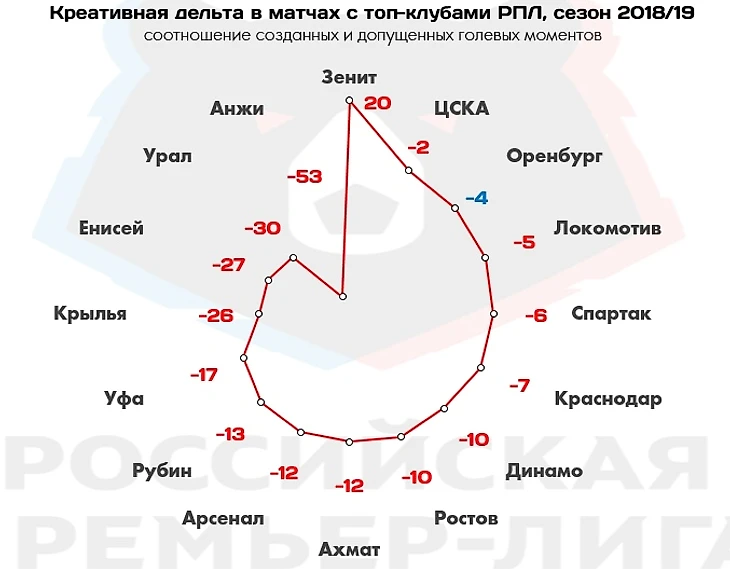 Символические «-4» по креативной дельте в матчах против топ-клубов (лучший показатель среди команд «второго эшелона») – очевидный индикатор того, насколько эффективно работала игровая система «горожан» в поединках, где соперник вынужден был действовать «первым номером» и много возиться с мячом.