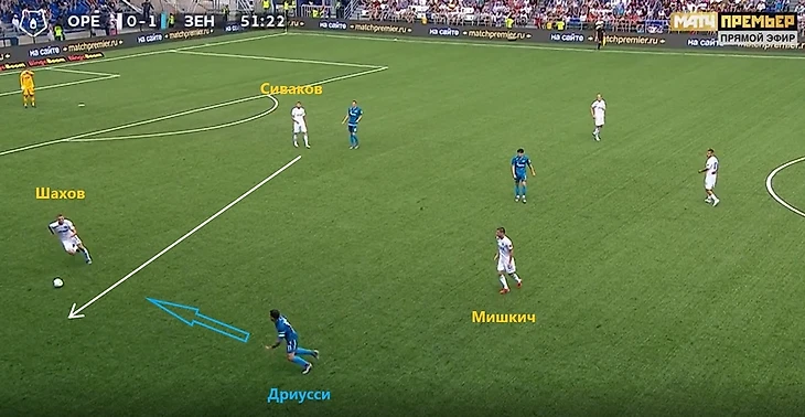 Эпизод 2. Сиваков под давлением Дзюбы отдает не слишком удобную передачу на Шахова, которого тут же несется накрывать Дриусси.