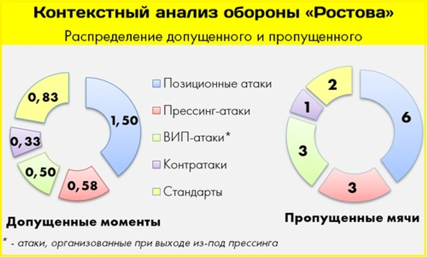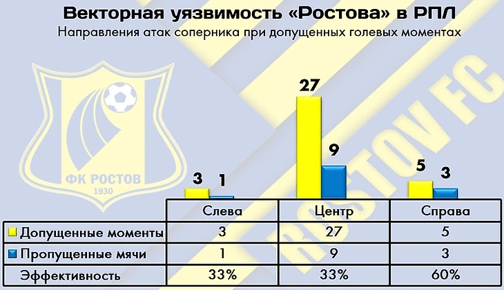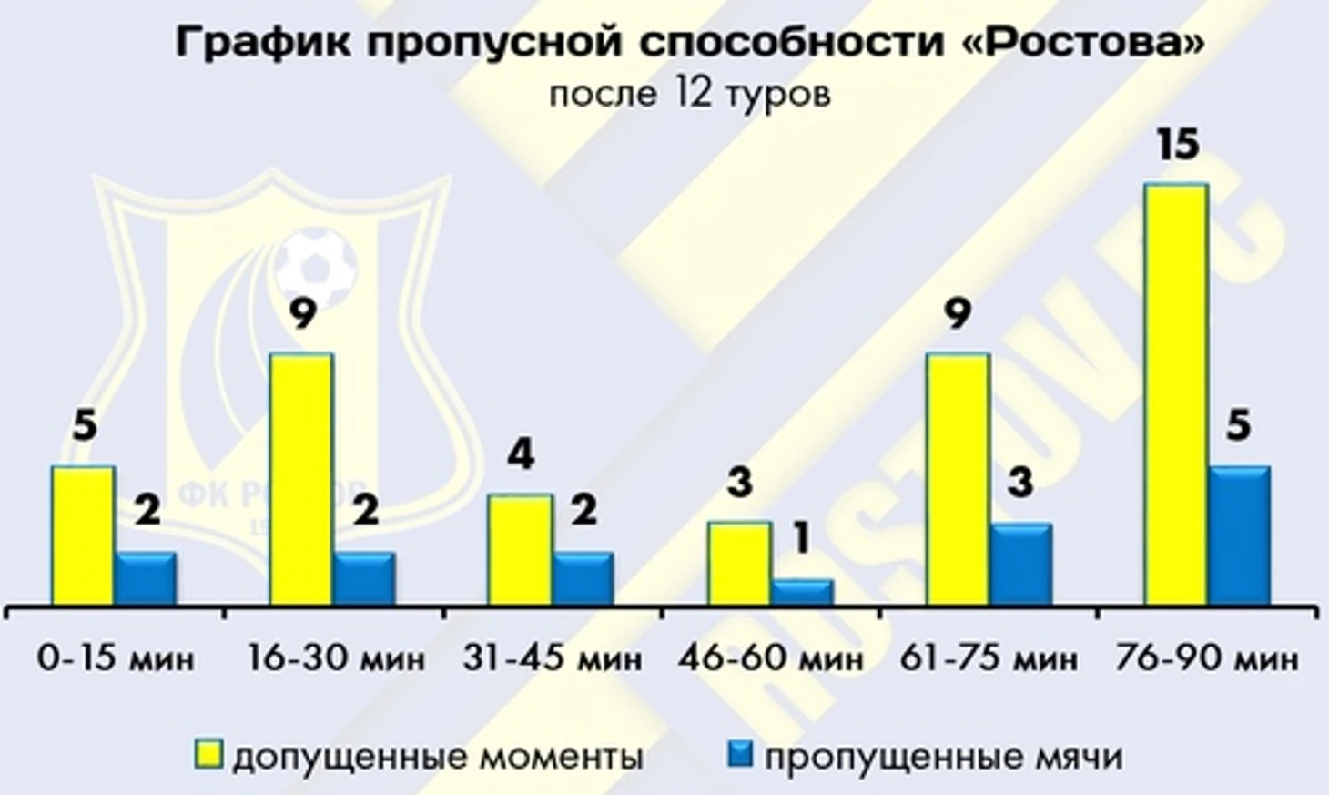 На качество оборонительных действий «Ростова» напрямую влияет усталостный фактор, поскольку более половины допущенных моментов (24/45) и пропущенных мячей (8/15) приходятся на финальные 30 минут.