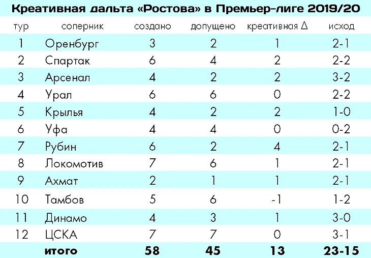 Если в прошлом чемпионате по креативной дельте дончане были лишь в символическом плюсе с отношением созданных шансов к допущенным 3,03/2,83 (и итоговыми «+2» по разнице мячей), то сейчас после 12 туров «Ростов» имеет куда более серьезный игровой перевес над соперниками – 4,83/3,75.