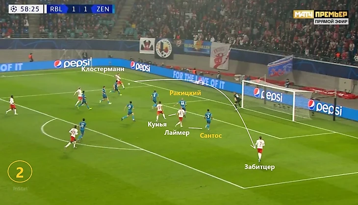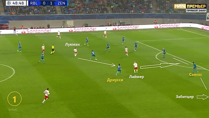 Эпизод с первым голом: Лукман делает проникающую между линиями, Лаймер стоит в пол оборота, Дриусси на рывке пытается схлопнуть воздушный пузырь. Если бы Себа не притормозил на секунду, ему бы хватило скорости, чтобы поддержать рывок австрийца в полуфланг.