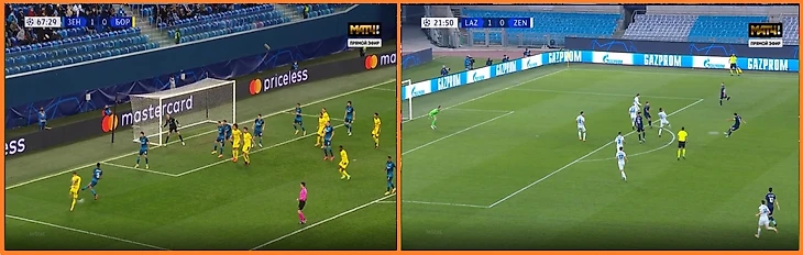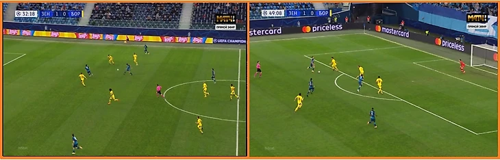 В этом эпизоде четыре защитника и оба опорника Зенита находились внутри штрафной - при том, что Боруссия развивала атаку в прямом смысле пешком, а Витселю перед ударом еще пришлось укрощать небрежный пас от Санчо (т.е. при более плотной опеке дело вполне могло кончиться потерей).