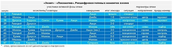 В позиционной статике «Зенит» тоже был в полном порядке, методично наказывая соперника за ошибки. Три ударных момента преобразовались в три гола (включая атаку, по ходу которой был заработан пенальти). Неплохо с учетом того, что до этого «железнодорожники» пропустили всего 6 мячей в «позиционке» за весь чемпионат.