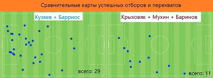 На пару с Вильмаром они не только перекрыли кислород Крыховяку, Баринову и Мухину, плотно сыграв перед своей штрафной, но и по необходимости качественно страховали фланги. Сравнительная карта удачных отборов и перехватов наглядно показывает, насколько более эффективно в разрушении действовали зенитовские опорники.