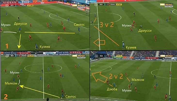 Как и ожидалось, во-многом характер матча и его исход определили переходные фазы, в которых гораздо изобретательнее, мобильнее и резче действовали хозяева. «Зенит» забил дважды после удачных попыток высокого прессинга (о том, что у «Локо» с устойчивостью под давлением есть проблемы, мы писали в предматчевом разборе), причем оба раза – изящными парашютами за спину Гильерме (и это к вопросу об изобретательности!). Но фактически поворотным стал первый гол Дзюбы, который вынудил гостей играть в крайне невыгодном и непривычном для них ключе.