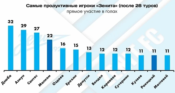 4. Малком в двух последних матчах поучаствовал в 10 голах из 12 (!), и вслед за Дзюбой, Азмуном и Сантосом преодолел отметку в 20+ результативных баллов за чемпионат (теперь у бразильца их 22). Между прочим, впервые за последние 7 сезонов «разменять двадцатку» удалось сразу 4 игрокам «Зенита».