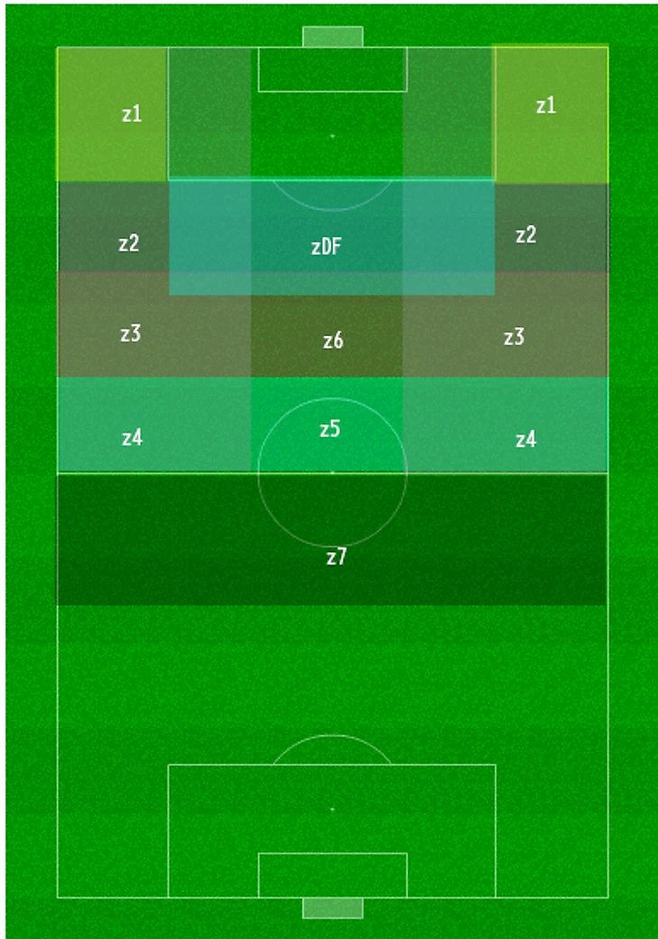 В корректировках расположения помогает деления футбольного поля на зоны вне зависимости от структуры обороны, показанные на картинке, линии обороны будет примерно одинакова вне зависимости фланга