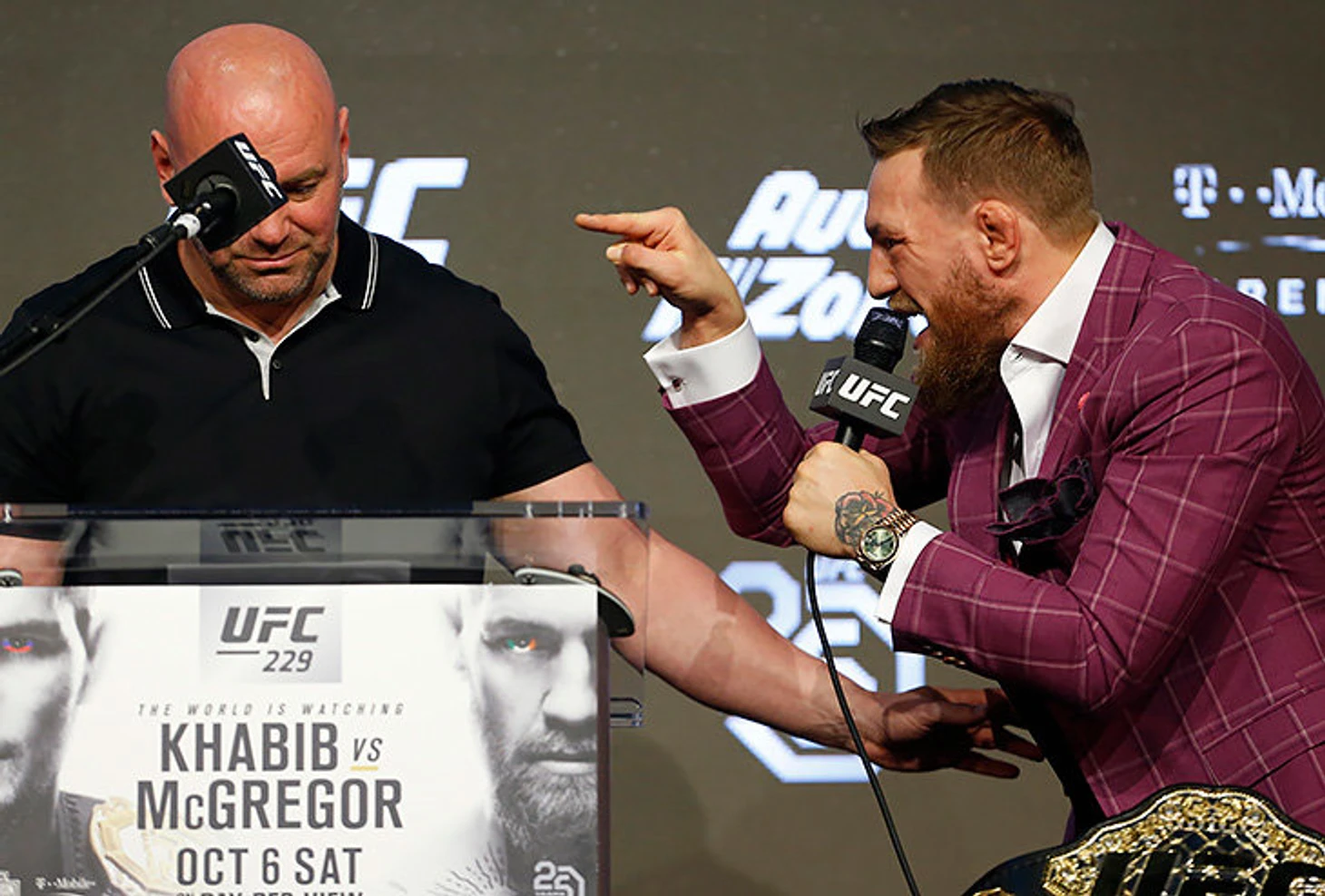 Конор: Серьезно? А давай! Давай прямо здесь! – Конор вскочил со стула, но приблизиться к Хабибу ему не позволил босс UFC Дэйна Уайт. – У меня нет с собой оружия. Посмотри на мои руки – в них ничего нет. Я здесь, парень. Я готов драться, я буду воевать. А ты прятался от меня в том автобусе. Ты баба! Ты сидел в автобусе и боялся. Ты не вышел ко мне и ничего мне не сделал. Да ты и сейчас боишься. Ты никто! Ты пустое место.