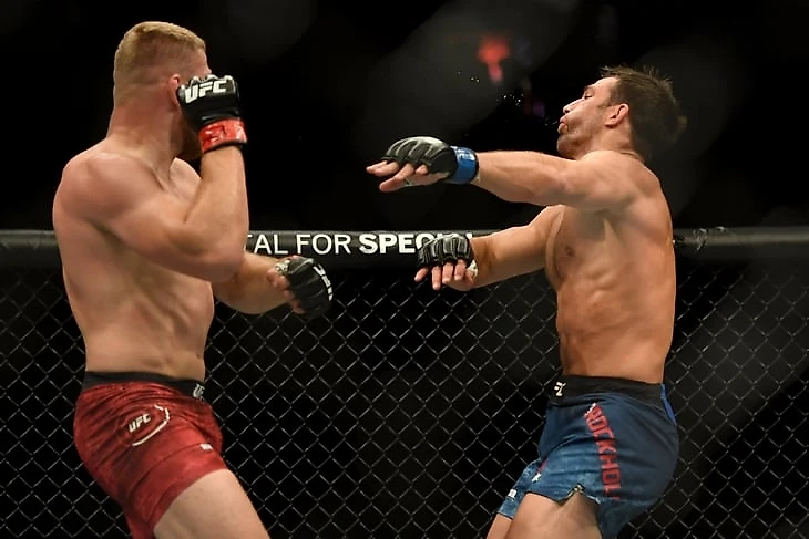 5:35. Санчес просто-напросто устал сдерживать натиск Майкла. Стоит на ногах, пытается бить, но замедлился до невозможности. Кьеза продолжает ронять первого победителя TUF раз за разом.