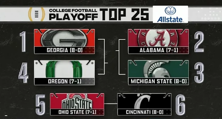 Номер 1 - Джорджия. Вопросов нет, 8-0, вероятно самая конкурентная конференция. Джорджия имеет отличные шансы на плей-офф и в случае поражения в финале конференции и даже в случае осечки в регулярном сезоне, и даже в случае обеих. На втором месте Алабама - очевидно комитет считает поражение от Техаса A&M достойным. В моём предсказании она была на 4 месте, также в зоне плей-офф. Хейтеры Алабамы скажут, что комитет завысил рейтинг Миссисипи Стейт (который обыграл Техас) и тем самым Техаса, повысив статус поражения Алабамы. Напомним, в момент игры Техас был вне топ-25. Во всю идут разговоры, что будет, если Алабама некрупно уступит Джорджии в финале SEC -- кажется тогда комитет впервые возьмёт команду с двумя поражениями. Впрочем, Обурн пока контролирует свой путь в западном дивизионе и ещё может подставить подножку Кримсон Тайд. Далее, на третьем месте Мичиган Стейт. На том же месте Спартанцы были и по моим предсказаниям. Ниже Алабамы их разместил комитет, посчитав, что победа над Мичиган хуже чем победа надо Оле Мисс и Флоридой (пусть и в два очка у Алабамы). У Мичиган Стейт всё просто -- все победы и место в плей-офф. Одно поражение не вычёркивает их из рассмотрения. Четвёртыми комитет поставил Орегон. У меня были пятыми. Что важно -- комитет считает победу над Огайо Стейт важнее поражения от Стэнфорда, тем более что координатор атаки Орегона ту игру пропускал из-за здоровья. Тем не менее, даже итоговые 12-1 не гарантируют Орегону место в плей-офф и им нужна помощь соперников. Например, Алабама, Джорджия с одним поражением и Мичиган Стейт и Оклахома без поражений оставят Орегон вне топ-4. Интереснее будет если Орегон за топ-4 будет сравнивать с Огайо Стейт (с одной стороны очная встреча, с другой стороны сила соперников и слабость команды, обыгравшей Орегон). Так что пока Уткам рано радоваться. На пятом комитет поставил Огайо Стейт, которые также контролируют свой путь, победы над Мичиганом и Мичиган Стейт, а затем в финале конференции выведут Бакайс в плей-офф. Шестыми комитет поставил Цинциннати (у меня были вторыми, как и в основных рейтингах AP и тренеров), но как я писал, если будет шанс не взять Цинциннати, то комитет им воспользуется. Главная победа у Медведей над Нотр Дам в гостях и это больше, чем победы у той же Оклахомы (потому и Цинциннати выше), но больше серьёзных по меркам комитета матчей не планируется. Сила расписания у Медведей сотая в стране, ресурсов обогнать команды выше без их осечек у Цинциннати нет, более того, даже в случае безупречной игры их могут обойти Оклахома (игра с Оклахома Стейт и Бэйлор, которые также в топ-25 и финал конференции) и Нотр Дам. Статистика говорит, что средняя команда топ-25 имеет 26% шанс иметь 13-0 с тем расписанием, что есть у Медведей. На седьмой позиции комитет поставил Мичиган (у меня девятые), впереди Нотр Дама и Оклахомы(!), очевидно комитет высоко оценивает как победы Росомах, так и гостевое поражение от Мичиган Стейт. Восьмыми идёт Оклахома, Сунерс полностью контролируют свой путь, в случае 13-0 они будут в плей-офф, но одно поражение сильно изменить ситуацию и огромный вопрос, кого гипотетически возьмёт в топ-4 комитет - Орегон или Оклахому с одним поражением, или Цинциннати. Шансы последних выглядят не такими высокими. Девятыми и десятыми по мнению комитета являются Уэйк Форрест и Нотр Дам (у меня были 10 и 8 соответст