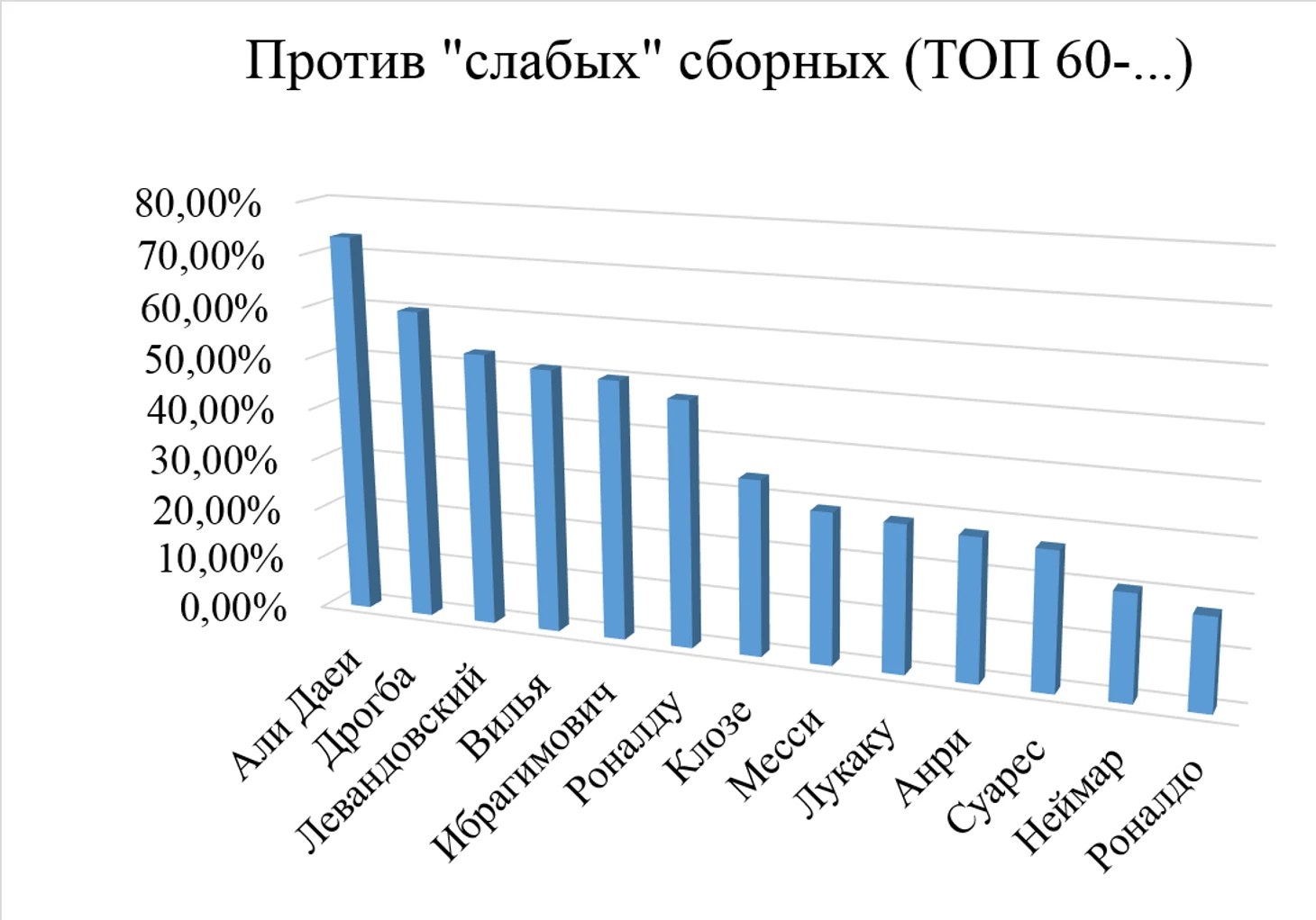 Со слабыми сборными лучше всего справляются Али Даеи, Криштиану Роналду, далее Дрогба и Левандовский. Хуже всего со слабыми командами себя показывают – Неймар, Анри, бразилец Роналдо.