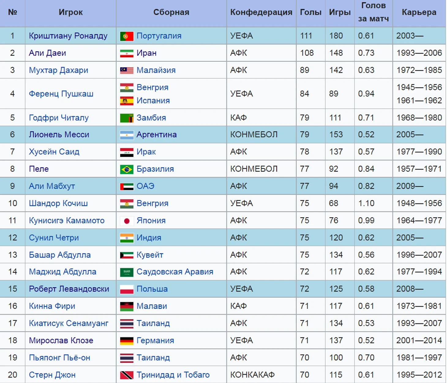 Далее, чтобы создать общую картину по этому показателю в футболе, предлагаю посмотреть на данные о лучших бомбардирах на уровне сборных (здесь приведены первые 20 позиций).