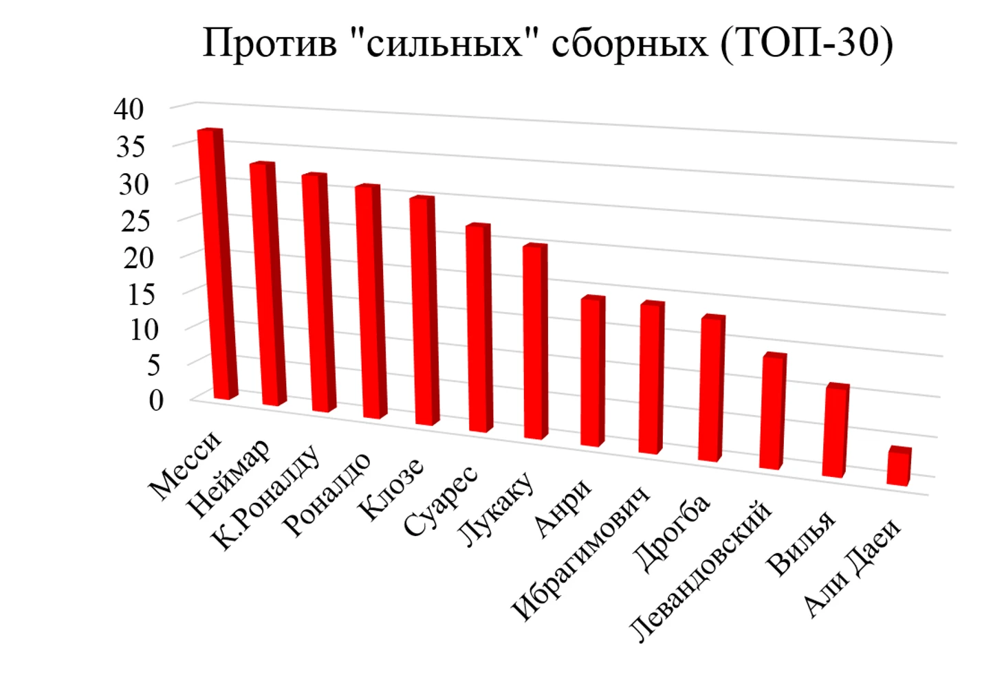 Наибольшее количество голов против «сильнейших» сборных у Месси, следом идут Неймар, Криштиану Роналду, бразилец Роналдо и Мирослава Клозе. Наименьшее – у Али Даеи, Давида Вильи и Роберта Левандовский.