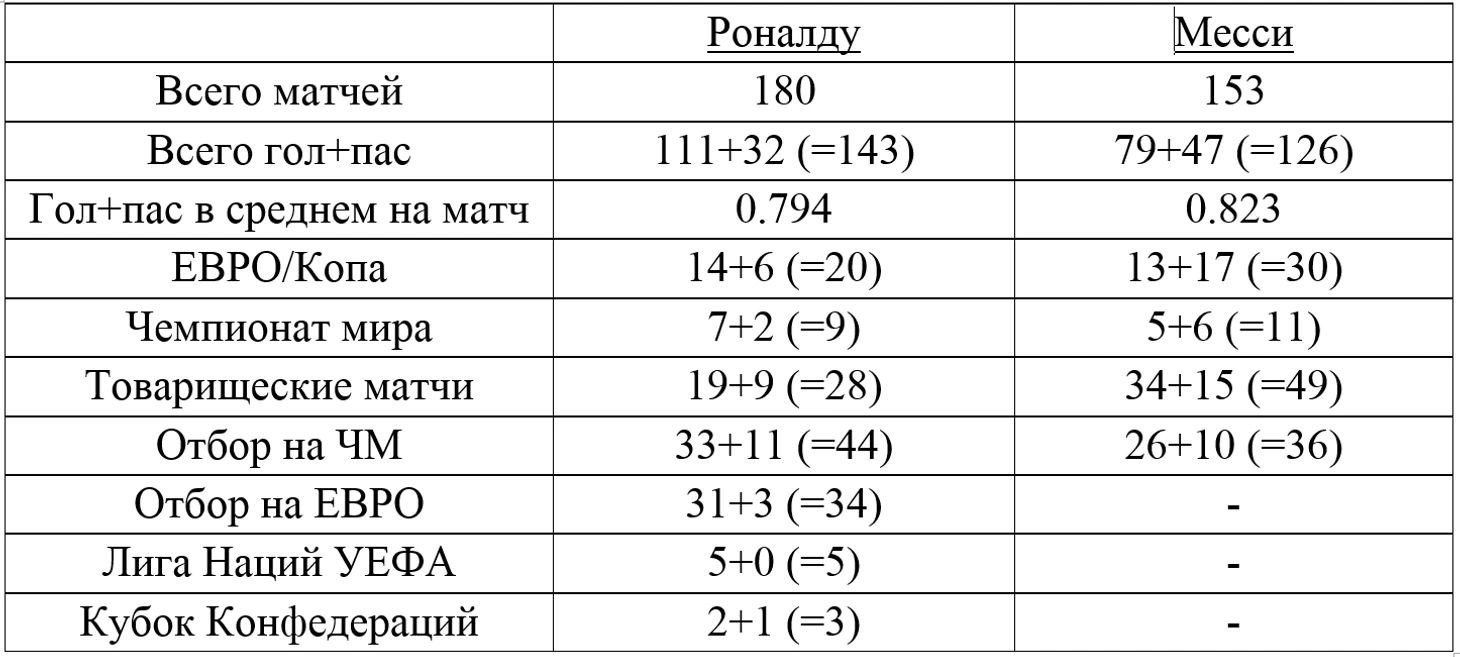 На двух главных турнирах на уровне сборных для каждого футболиста, чемпионат мира и чемпионат континента (ЕВРО для Криштиану, КОПА для Месси), у португальца 21 гол + 8 голевых пасов (29 всего), у аргентинца 18+23 (41 всего). Здесь аргентинский нападающий лучше. Обратите внимание на строку отборочных матчей в таблице. В квалификации к мировому первенству на несколько голов больше у Криштиану Роналду. Разница по общему количеству голов между ними, на которую опираются многие «знатоки», возникает в большей степени из-за существования квалификации к ЕВРО. Поклонники португальца скажут, что Месси набивает статистику в товарищеских матчах. Но у аргентинца просто нет возможности играть в отборе на ЕВРО! В перерыве клубных матчей, когда проходят матчи между сборными, Португалия выступает в квалификации к ЕВРО, а команды, которые не участвуют в этих играх, либо проводят товарищеские матчи, либо не играют совсем. И даже если говорить о товарищеских матчах, то у Роналду за 51 товарищескую игру 19 голов и 9 голевых пасов (28 результативных очков всего), у Месси за 47 игр 34+15 (49 всего).