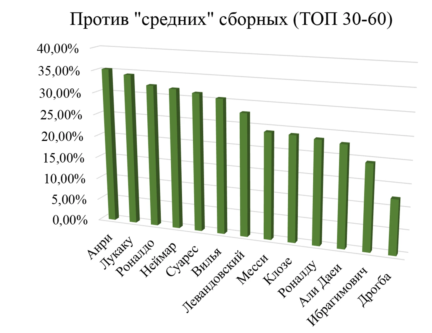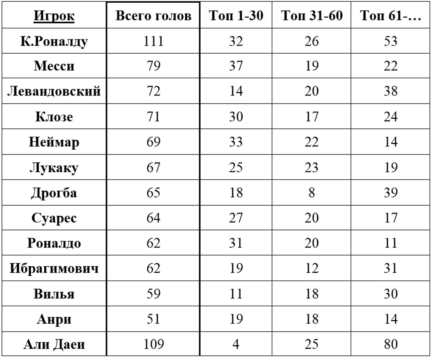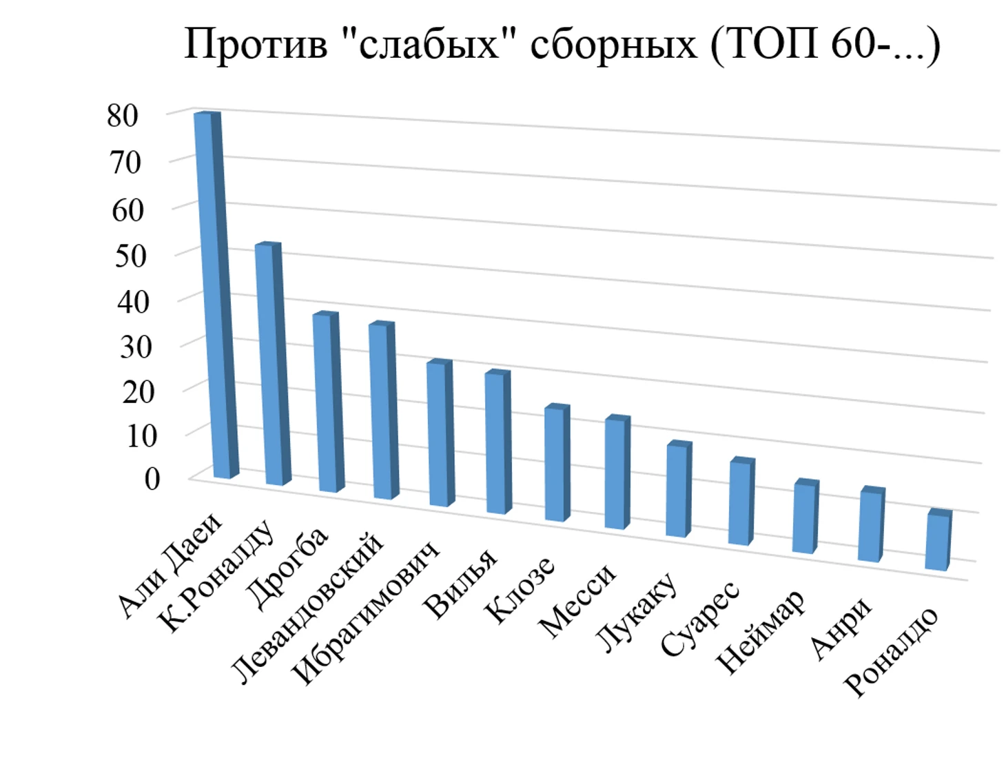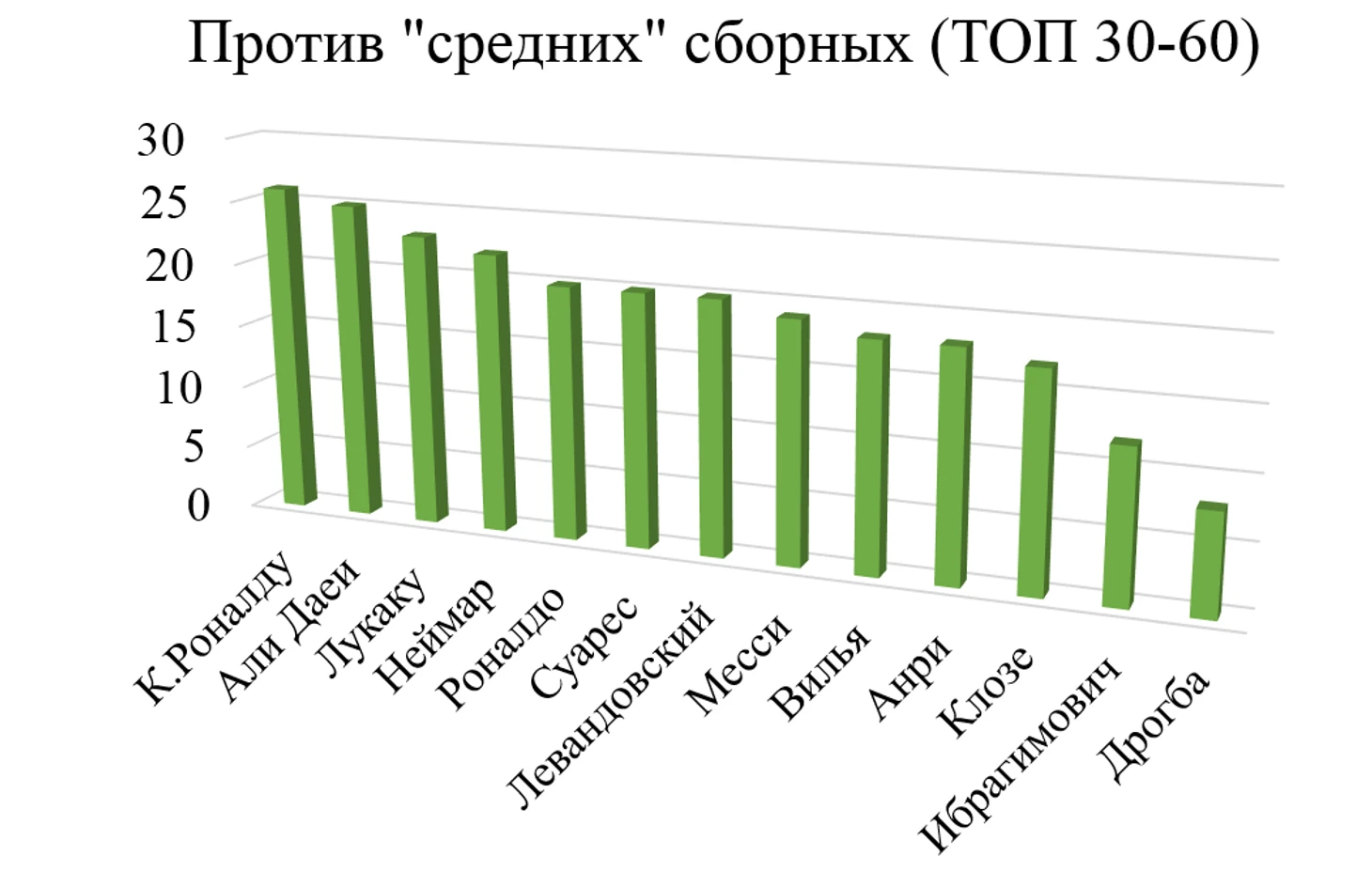Наибольшее количество голов против «средних» сборных у К. Роналду, Али Даеи, Лукаку, Неймара. Наименьшее – у Ибрагимовича и Дидье Дрогба.