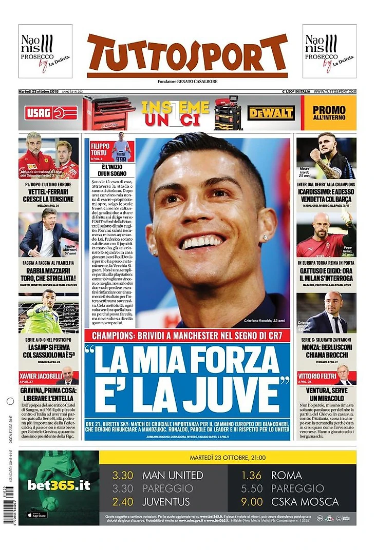 Лига Чемпионов: мурашки в Манчестере под знаком CR7. В 21:00 (CET), в прямом эфире Sky: ключевой и важный матч для европейского пути Бьянконери, которые должны отказаться от Манджукича. Роналду, слова лидера и уважение к «Юнайтед».