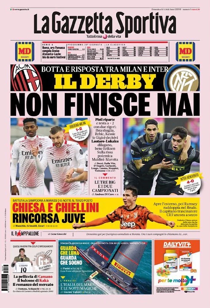 Дерби не закончится никогда. Заголовки Gazzetta, TuttoSport и Corriere за 31 января
