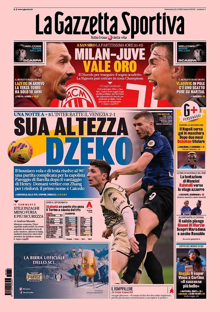 «Его высочество Джеко» – таким титулом наградила Gazzetta боснийского бомбардира после победы «Интера»: «Одна ночь с преимуществом в 5 очков. «Интер» победил «Венецию» 2:1. Босниец взлетел и на 90 минуте выиграл трудный матч для лидера. Барелла сравнял после того, как Анри вывел вперёд. Завтра встреча с Чжэном по усилению: первое имя – это Кайседо»