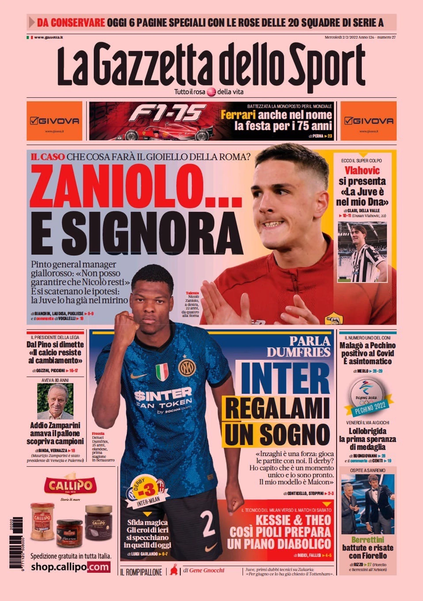 Gazzetta перед Миланским Дерби опубликовала интервью с Дензелом Думфрисом под заголовком: «Интер», подари мне мечту». «Индзаги – это сила: он играет матчи с нами. Дерби? Я понимаю, что это уникальный момент и я готов. Мой пример – это Майкон». Также миланское издание упомянуло и о тренерском плане «Милана»: «Кессье&Тео, так Пиоли готовит дьявольский план».