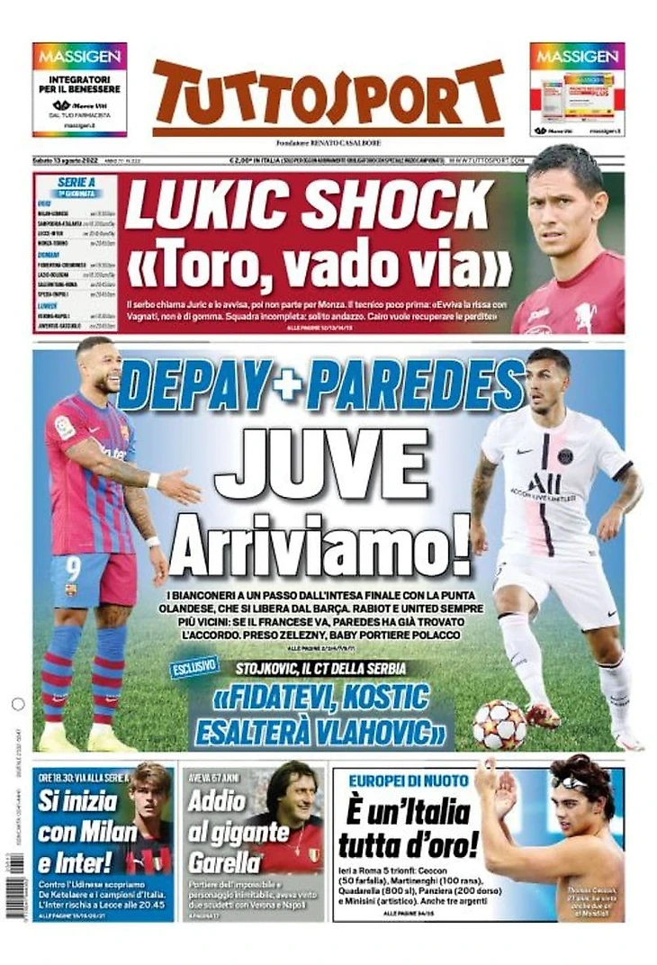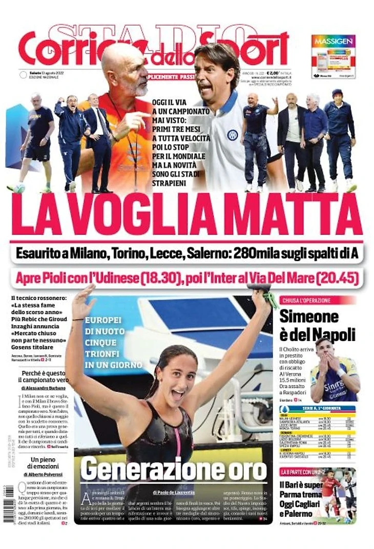 Море голов. Заголовки Gazzetta, TuttoSport и Corriere за 13 августа