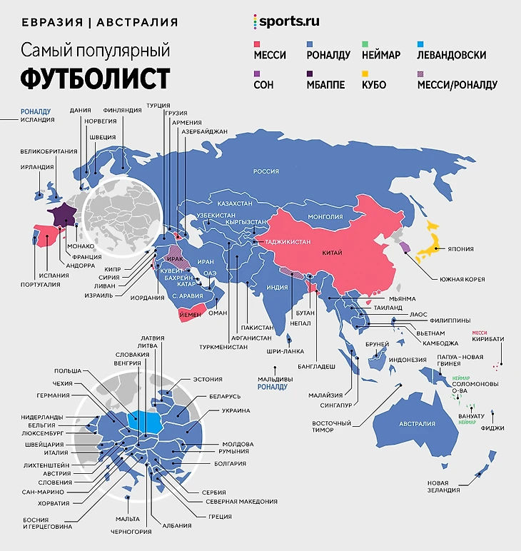 Только в пяти странах Европы, Азии и Океании популярнее всего местный футболист. В Португалии – Роналду, во Франции – Килиан Мбаппе, в Польше – Роберт Левандовски, в Южной Корее – Сон Хын Мин, в Японии – Такефуса Кубо.