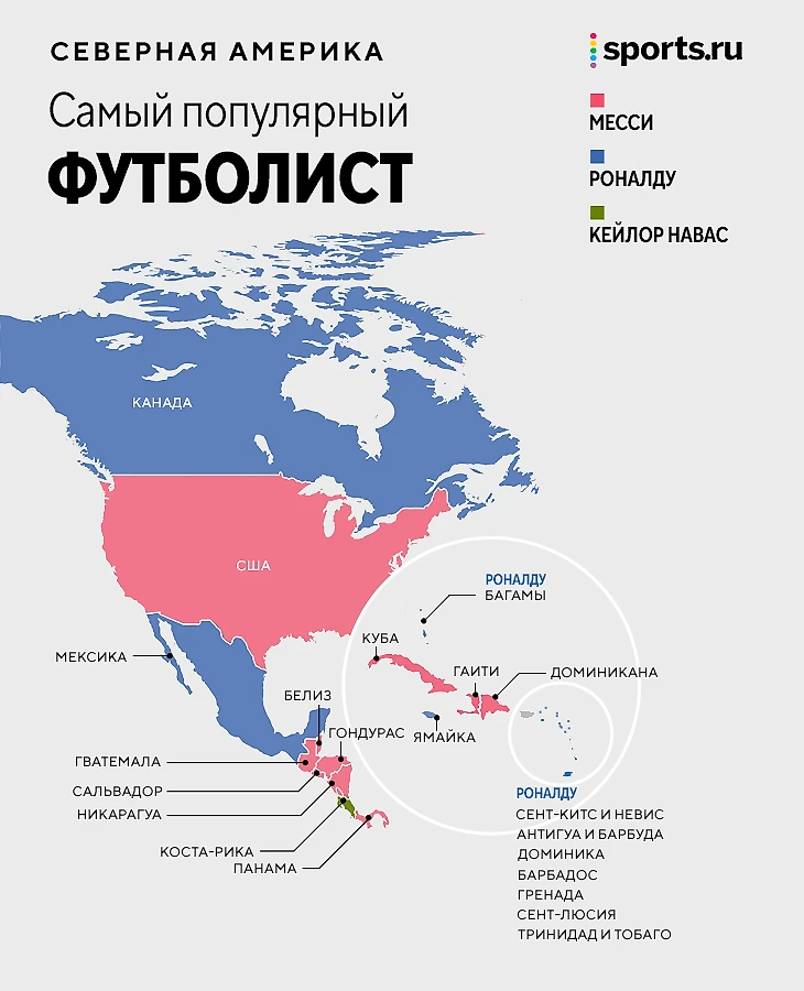 В Северной Америке тоже разделение. В Канаде, Мексике и на большинстве островов популярнее Роналду, в США, Белизе, Гватемале, Гондурасе, Сальвадоре, Никарагуа, Панаме, Доминиканской республике, на Кубе и Гаити – Месси.