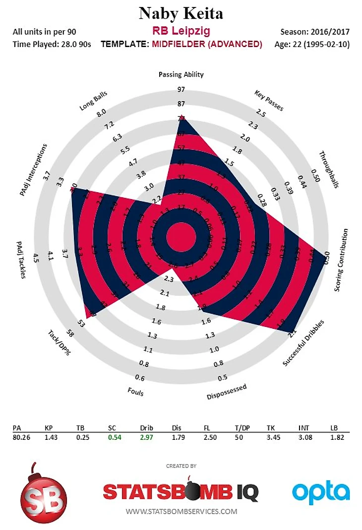 Понятно, что дело не только в школе, но и в целом в наборе уникальных данных, которыми обладает Кейта. Еще в Зальцбурге он выделялся сплавом очень высоких чисел по xG/90, xA/90 и количеству успешных обводок на 90 минут. Одновременно такой своеобразный трипл-дабл достигали в разные сезоны Месси, Неймар, Роббен и Рибери. Понятно, что общий уровень австрийской бундеслиги относительно топ-5 не позволял рейтинговать Кейта образца сезона-15/16 наравне с упомянутой выше четверкой, но в целом такие показатели заставляли как минимум обратить на него внимание и продолжить внимательное наблюдение уже в Лейпциге. Как потом выяснилось, он достаточно безболезненно перенес свои числа в немецкий Бундес-1.