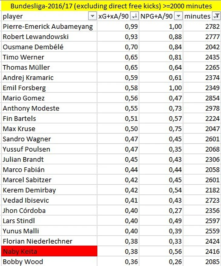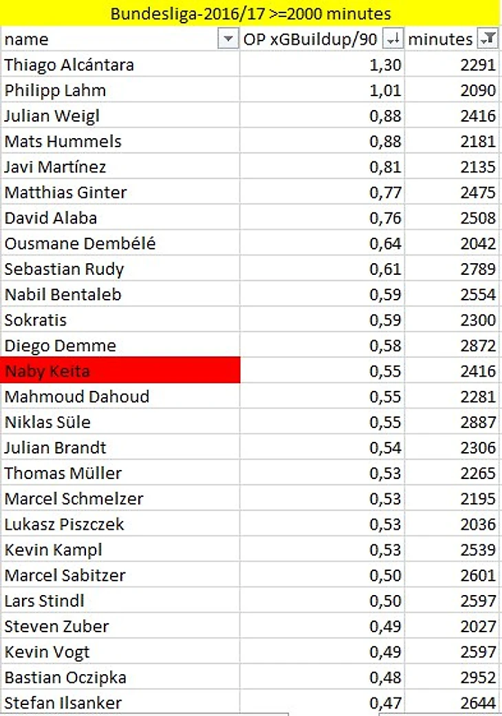 Так же Кейта входит в топ прошлого сезона Бундес-1 по xG+xA/90 – список, в котором господствуют страйкеры, десятки и крайние форварды. Из центральных полузащитников тут его обгоняют лишь Демирбай из «Хоффе», но из своих 0,42 xG+xA/90 он 0,11 набил со стандартов – ничего плохого, но просто Кейта не исполнял угловые и штрафные, поэтому с точки зрения опасности, созданной с игры, Кейта – лучший среди центральных полузащитников Бундес-1 прошлого сезона.
