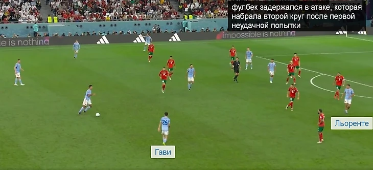 В целом, он действовал не как типичный фулбек, почти не шел вперед по флангу. У Энрике для него было заготовлено иное решение. Льоренте менялся позициями в полуфланге с восьмерками. Сначала, на шестой минуте, попробовал с Гави, как на первой иллюстрации. Затем — еще дважды в течение 10 минут.
