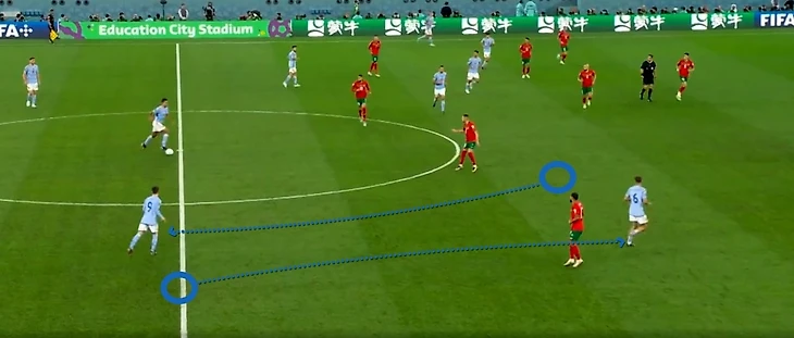 Стоит похвалить хавбека сборной Марокко Амалла, который грамотно перекрывал направление передач на Льоренте. У испанца и без того было ограниченное пространство для маневра ввиду низкого блока соперника и близкого расположения партнеров по обе стороны — марокканец делал ситуацию еще сложнее.