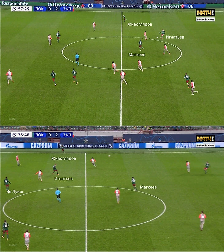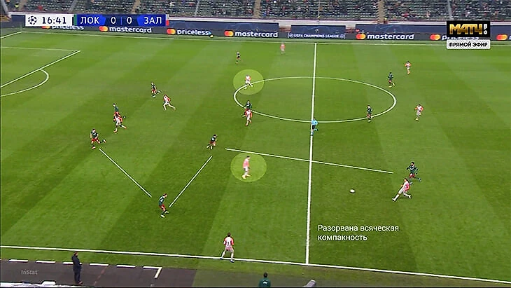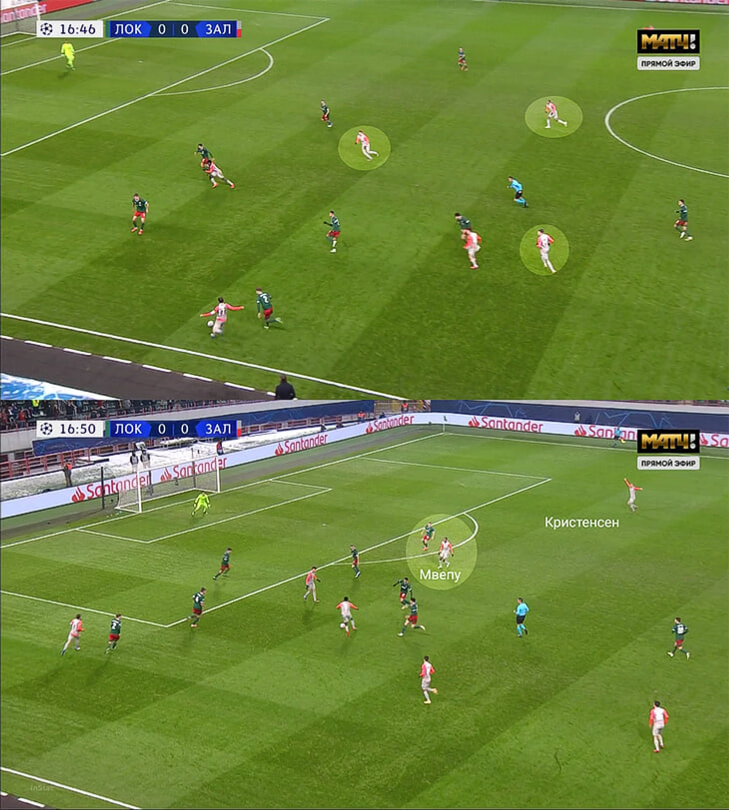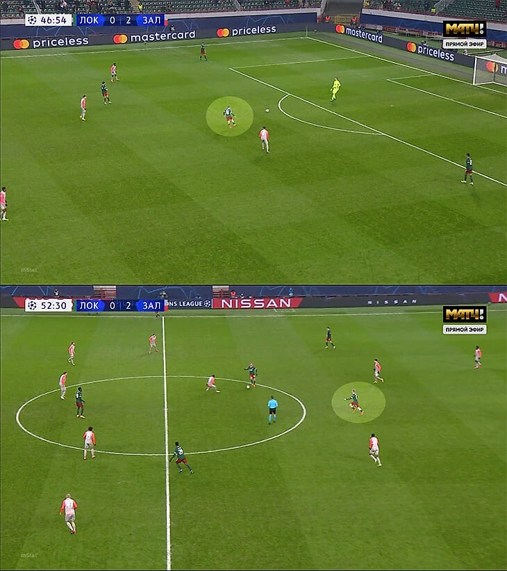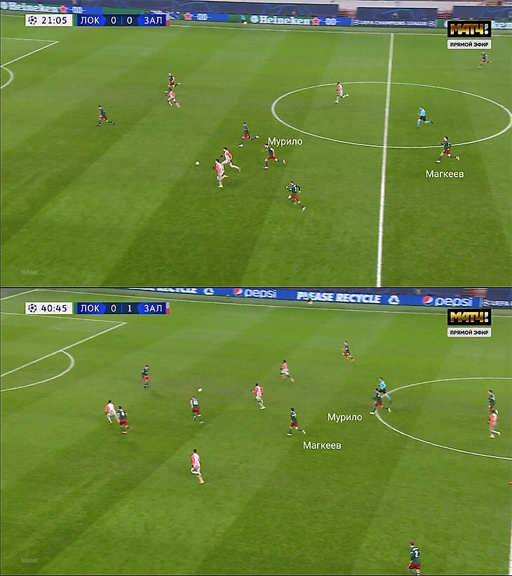 Высокий прессинг в исполнении «Локо» невозможен из-за слабой оборонительной работы нападающих. Зе Луиш и Эдер очень легко теряли игроков – по сути, это сразу минус два человека. Компенсировать последствия этой стилистики были вынуждены Мурило и Магкеев, но любое выдвижение вперед открывало свободные зоны за их спинами и оставляло трио защитников без поддержки. Как показала игра, такие выпады фатальны для Райковича и Лысцова. Тут показательны второй гол «Зальцбурга» (даже без учета привоза Райковича) и пара контратак.