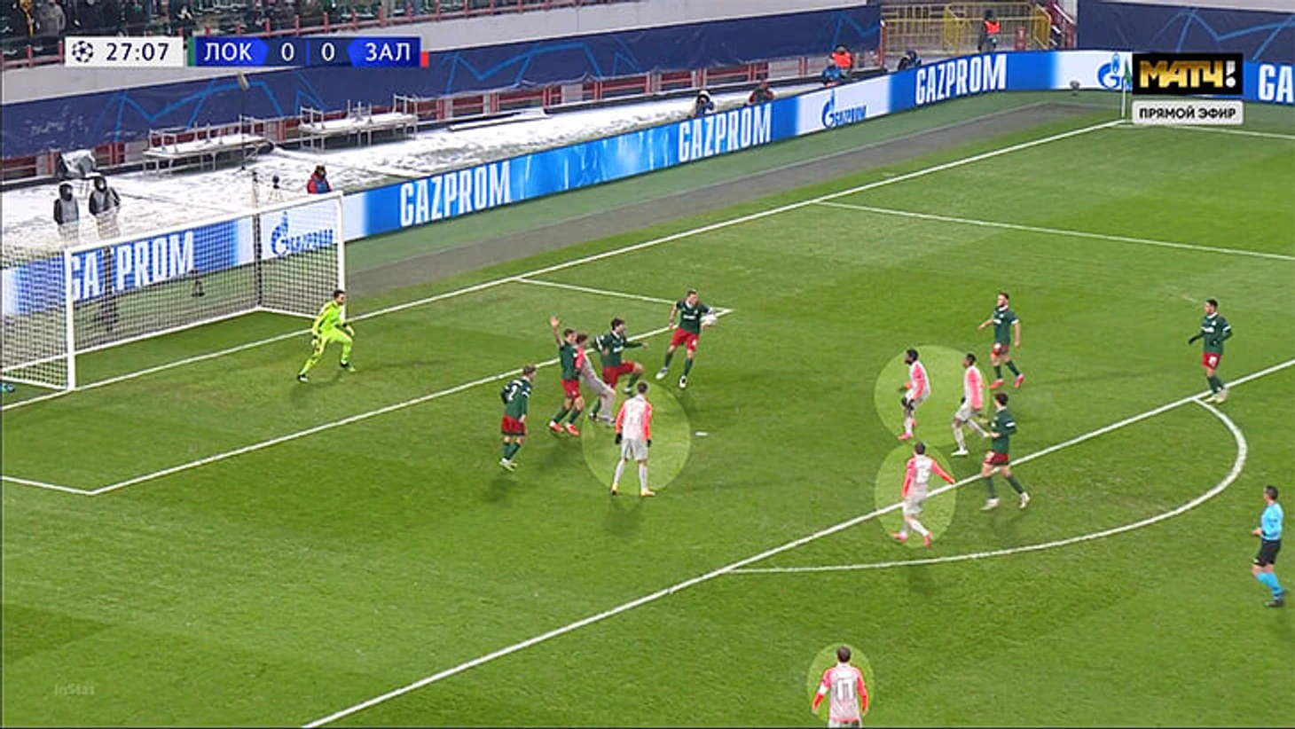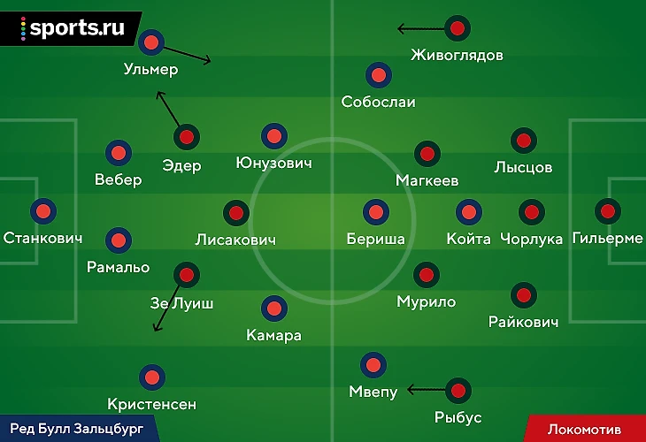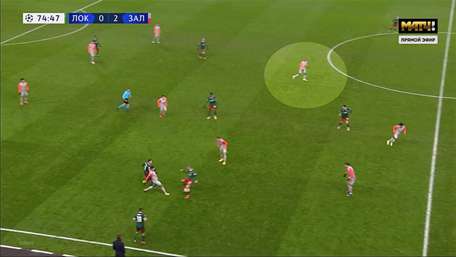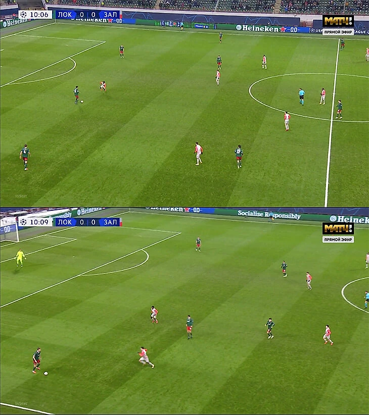 Высокий прессинг в исполнении «Локо» невозможен из-за слабой оборонительной работы нападающих. Зе Луиш и Эдер очень легко теряли игроков – по сути, это сразу минус два человека. Компенсировать последствия этой стилистики были вынуждены Мурило и Магкеев, но любое выдвижение вперед открывало свободные зоны за их спинами и оставляло трио защитников без поддержки. Как показала игра, такие выпады фатальны для Райковича и Лысцова. Тут показательны второй гол «Зальцбурга» (даже без учета привоза Райковича) и пара контратак.