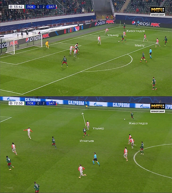 Выход Игнатьева добавил агрессии. Во-первых, он накрывал Ульмера. Давление приводило к длинным передачам, и «Локомотив» чаще встречался с мячом. Другой важный фактор выхода Владислава – он выполнял роль, которая схожа с ролью Собослаи и Мвепу. Регулярно уходил в центр, а это позволяло начинать атаки: фланг освобождался Живоглядову, численное преимущество в центре позволяло Магкееву или Мухину свободно получать мяч.