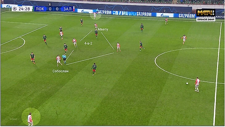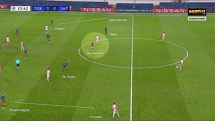 Важно асимметричное расположение крайних защитников: Кристенсен справа играл высоко, а Ульмер заставлял Живоглядова выбирать: если он не встретит игрока «Зальцбурга», тот будет свободен и при необходимости уйдет в центр, а если выдернется – Собослаи сразу заполнит свободную зону.