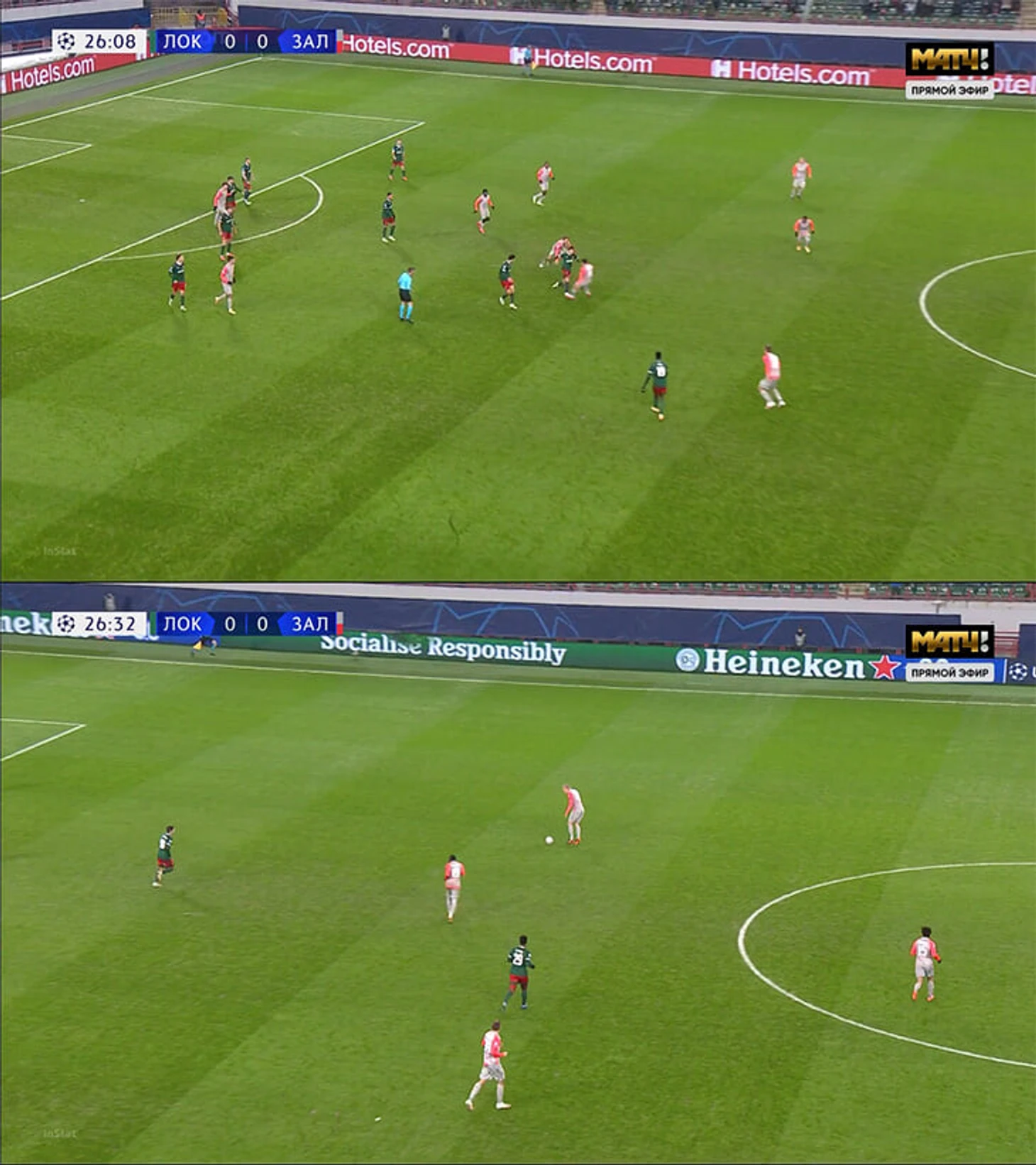 Партнеры продолжают это движение – вся атакующая четверка смещается в центр поля или растягивает центральных защитников широкими позициями. Вообще, такая игра удобна против «Локо»: москвичи активно шли в атаку и часто не успевали возвращаться, поэтому «Зальцбург» легко контратаковал.