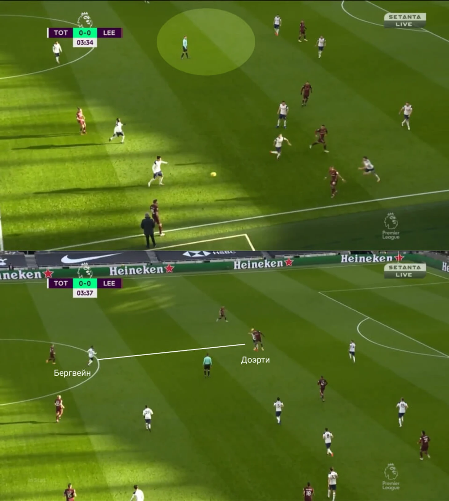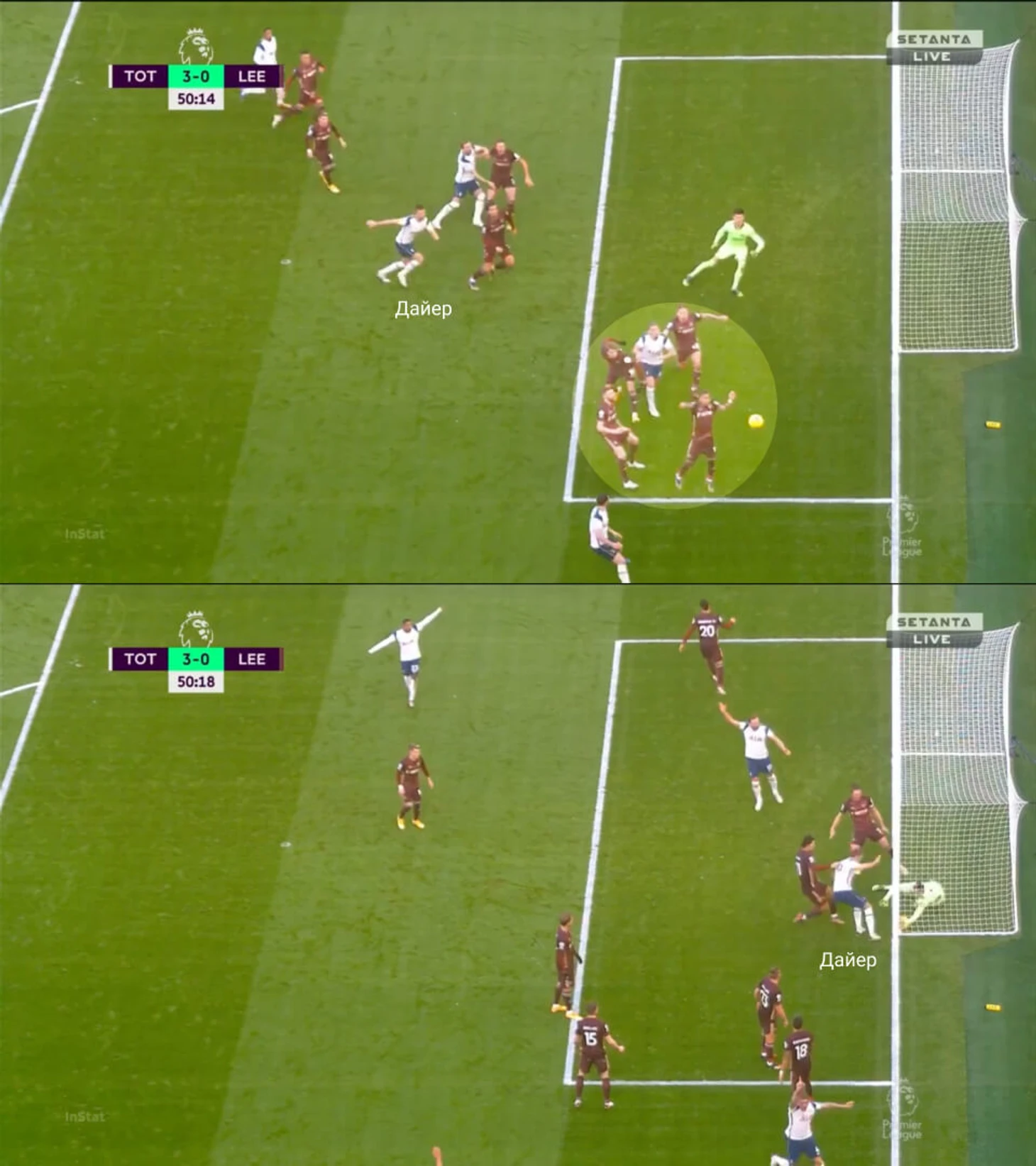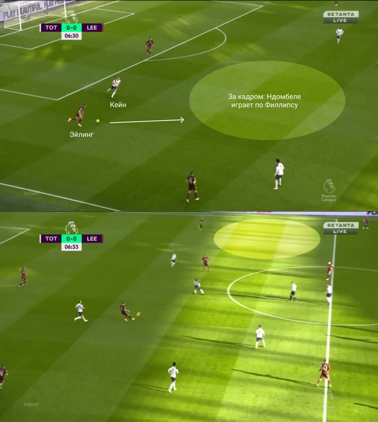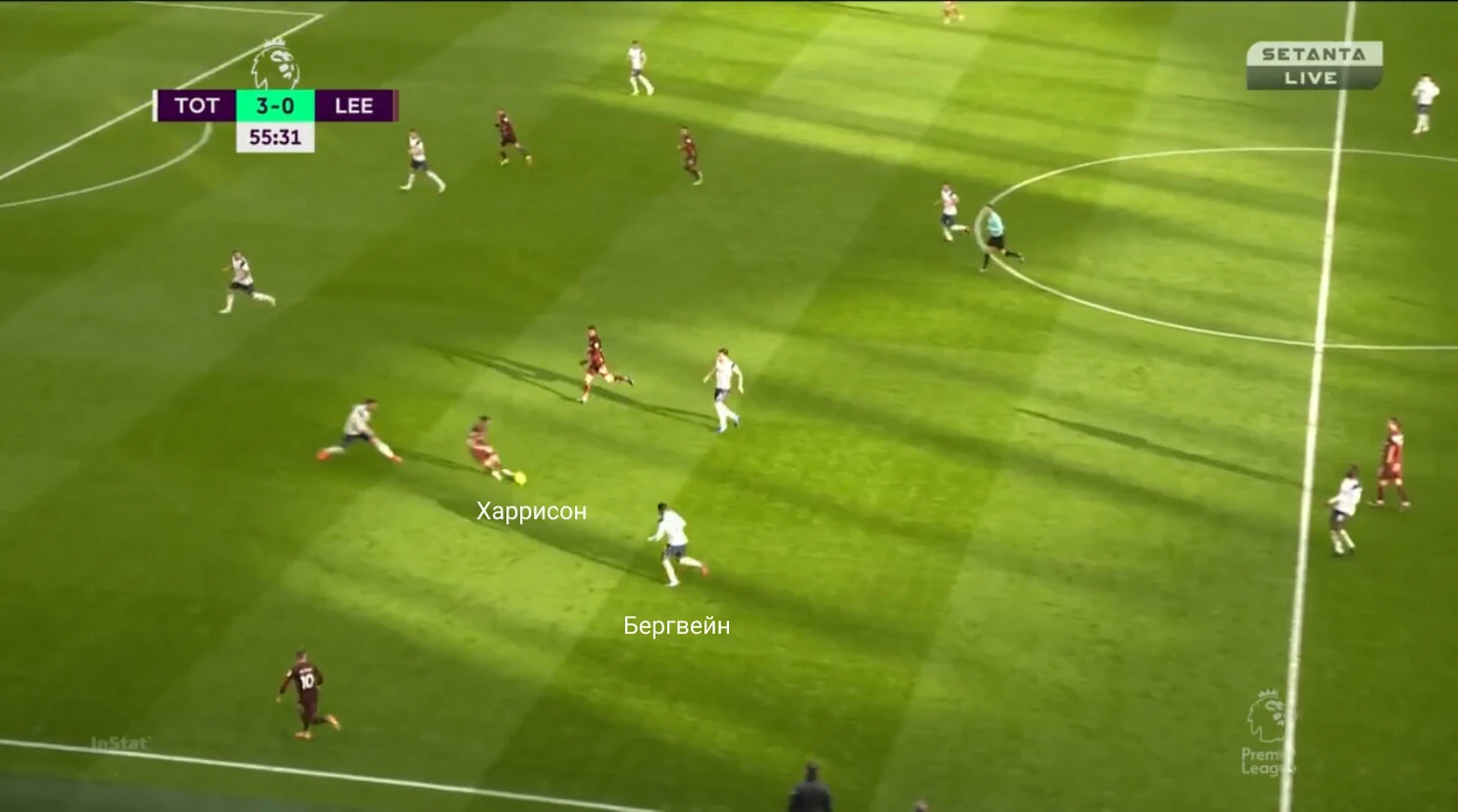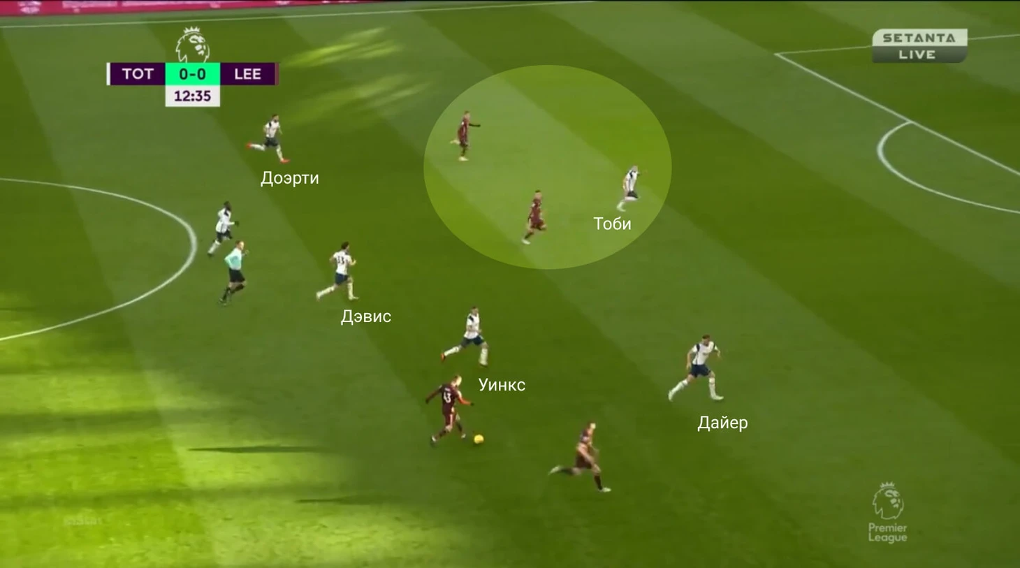 Дэвис и Сиссоко доиграли эпизод до конца, не позволив пройти через фланг. Этот пример показателен и с другой стороны: «Лидс» не подстроился под упущение «Тоттенхэма» и запорол очевидный шанс.